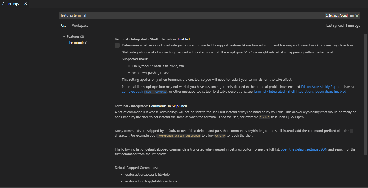 2. features terminal 검색 후 terminal > intergrated > shellIntegration 설정 비활성화